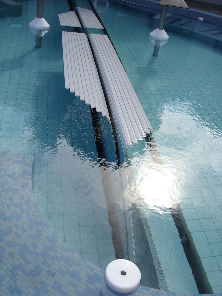 Von einer Abdeckung, die im Wasser versteckt ist, bis hin zum Wasser, das unter einer Abdeckung versteckt ist. In dieser deutschen Wellness-Anlage haben wir eine Rollenabdeckung in ein sogenanntes Bodenventil eingebaut. Auf diese Weise ist die Lamellenabdeckung völlig unsichtbar, bis sie auf Knopfdruck das gesamte Becken isoliert.